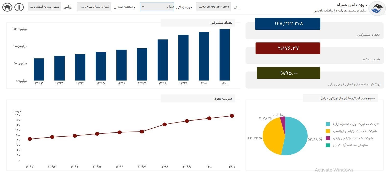 به گزارش خبرگزاری تسنیم، آخرین آمار سازمان تنظیم مقررات و ارتباطات رادیویی کشور (پایان 1401) در حوزه تلفن همراه نشان میدهد اکنون بیش از 148 میلیون نفر، مشترک تلفن همراه هستند و ضریب نفوذ استفاده از تلفن همراه در کشور را به 176 درصد رساندهاند.