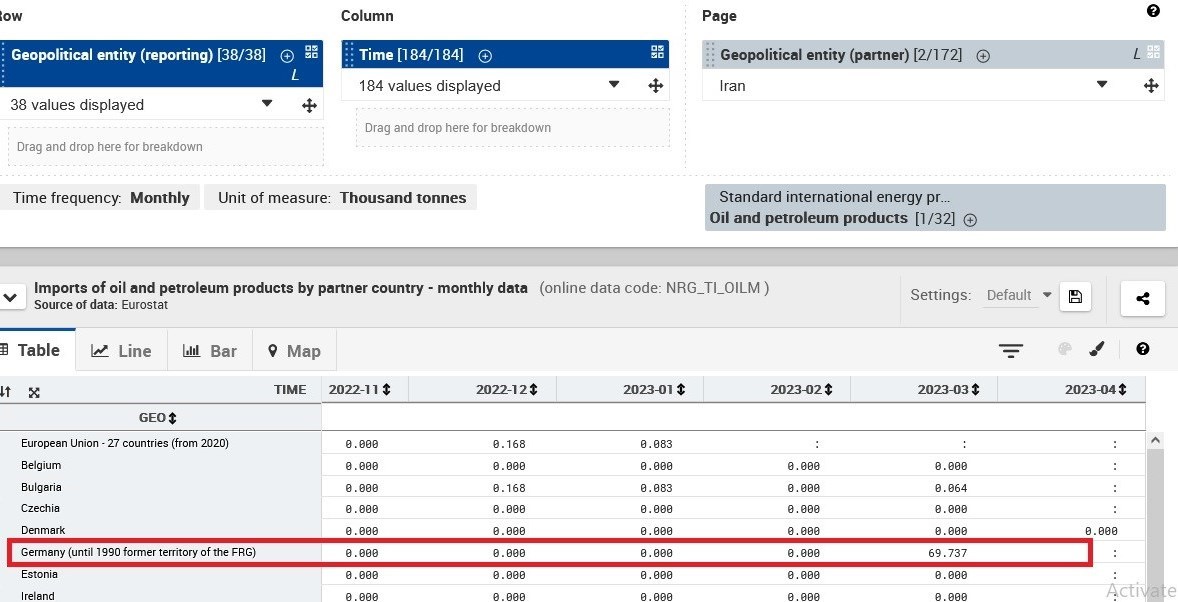 آلمان که آخرین بار در اکتبر 2018 یک محموله 10 هزار تنی نفت خام یا فرآورده نفتی از ایران وارد کرده بود در ماه مارس 2023 پس از حدود 5 سال 69 هزار و 737 تن نفت خام یا فرآورده از ایران وارد کرده است.