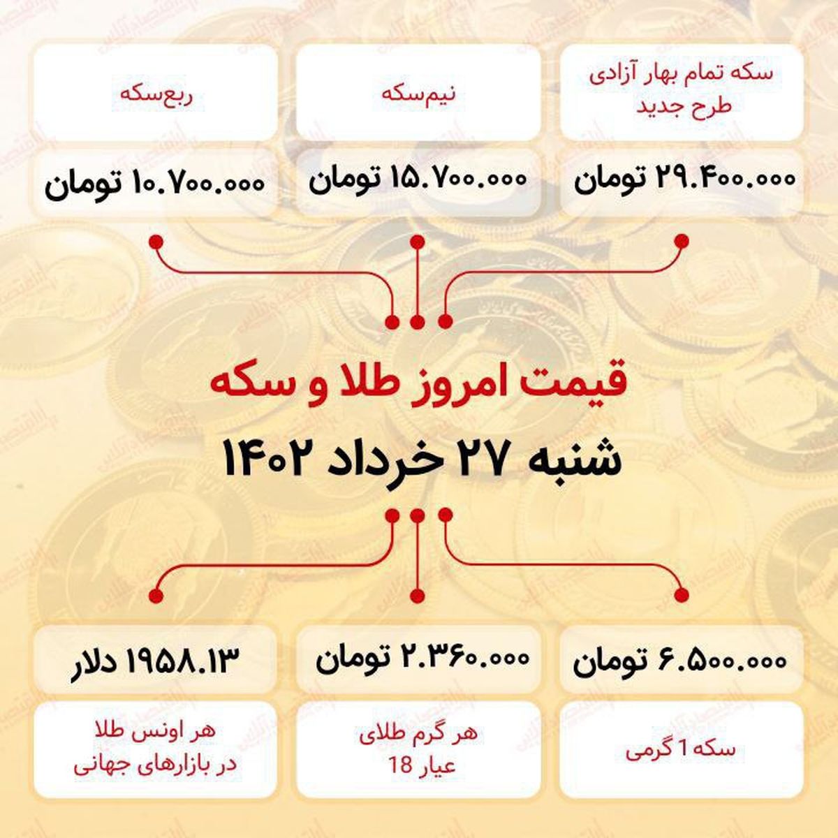 سکه به ۲۹ میلیون ۴۰۰ هزار تومان رسید (بیست و هفتم خرداد ماه ۱۴۰۲)