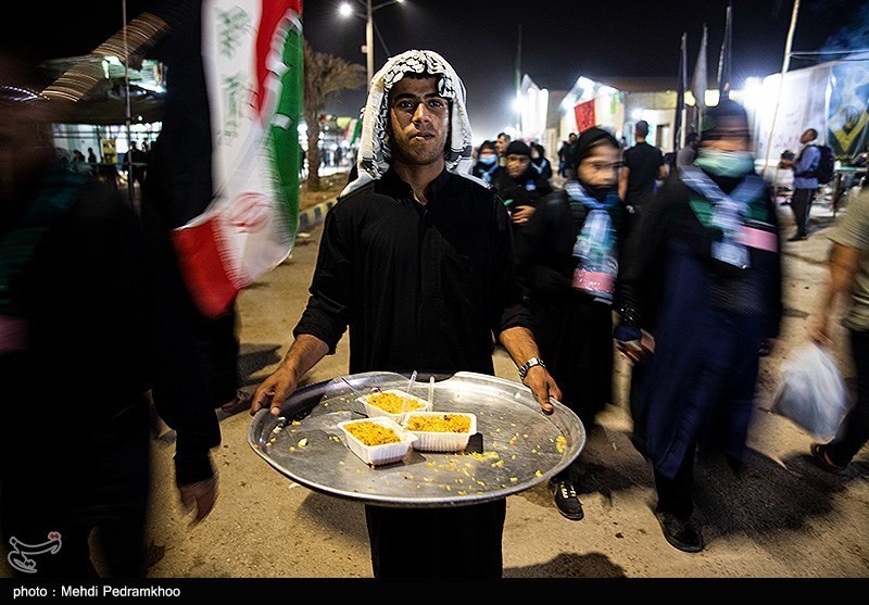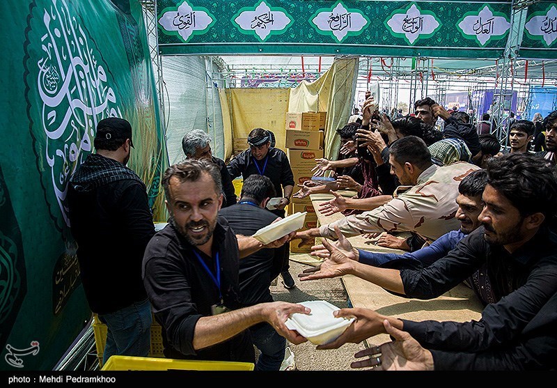 مردمانی که هر چه دارند در طبق اخلاص میگذارند و با پای دل میآیند در موکبها خدمترسانی میکنند تا از این قافله عشق عقب نمانند در اینجا پیرمردی اندک پول باقی مانده در جیبش را برای کمک به خدمترسانی به زائران به موکبها هدیه میدهد. آن طرفتر پیر زنی تنور خود را برای پخت نان کنار موکب بر پا میکنند. همه و همه با تمام دارایی خود حتی به اندازه قرص نان یا با شستن پای زائران به مردم خدمت میکنند و این خدمت را برای خود افتخاری بزرگ میدانند.