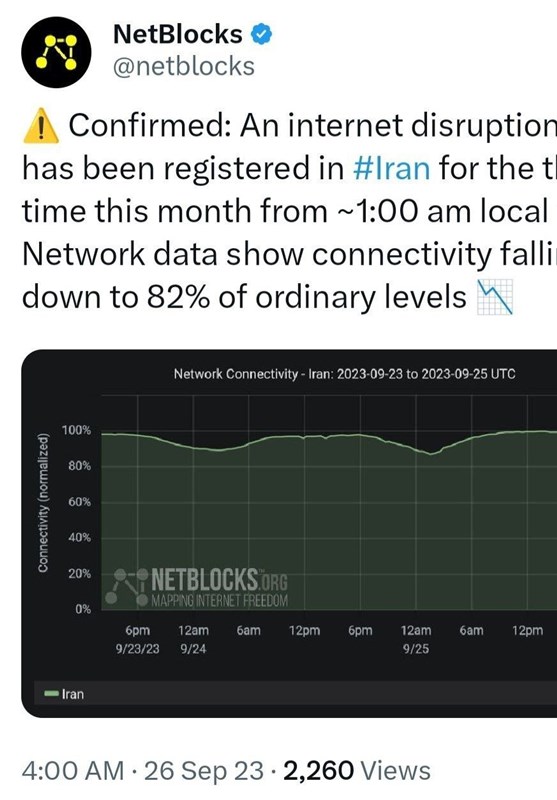 به گزارش خبرگزاری تسنیم، نت بلاکس اعلام کرد بامداد امروز اینترنت ایران برای بار سوم در یک ماه اخیر دچار اختلال شد و به سطح 82 درصد کاهش پیدا کرد.