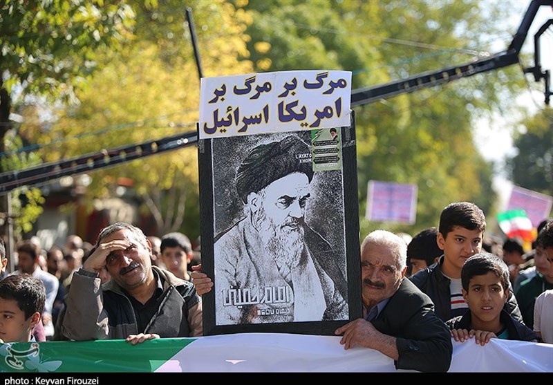 جمعی از دانش‌آموزان در این راهپیمایی پلاکاردهایی با مضامین مرگ بر اسراییل، مرگ بر آمریکا، 13 آبان ،یوم الله و جانم فدای رهبر در دست داشتند.