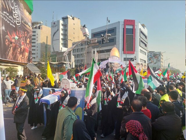این راهپیمایی با شعار رزمایش بزرگ و حماسی ۵۰ هزار نفری الی بیت المقدس از تقاطع خیابان های انقلاب و ولیعصر به سمت دانشگاه تهران در حال برگزاری است.