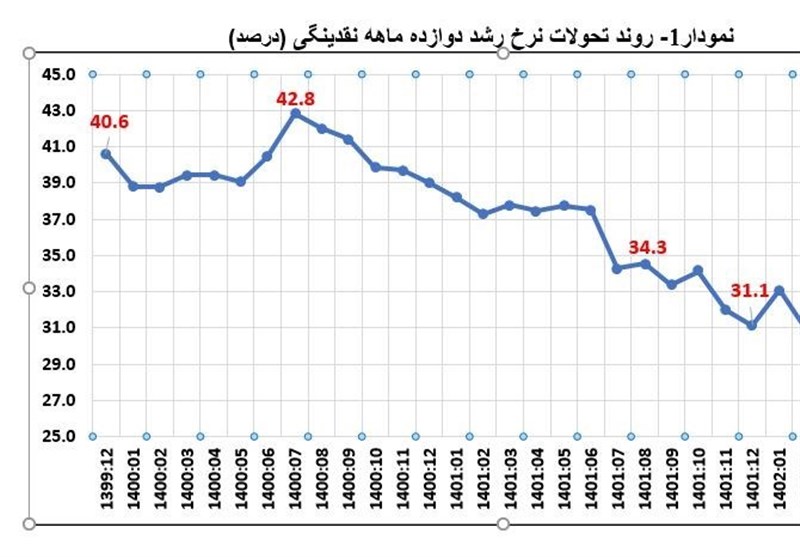 مرور مسیر طی شده نشان دهنده آن است که نرخ رشد دوازدهماهه نقدینگی از 42.8 درصد در پایان مهرماه 1400 طی یک روند نزولی به31.1 درصد در پایان سال 1401 و متعاقبا به 26.9 درصد و 26.4 درصد به ترتیب در پایان شهریور و مهرماه 1402 رسیده است.