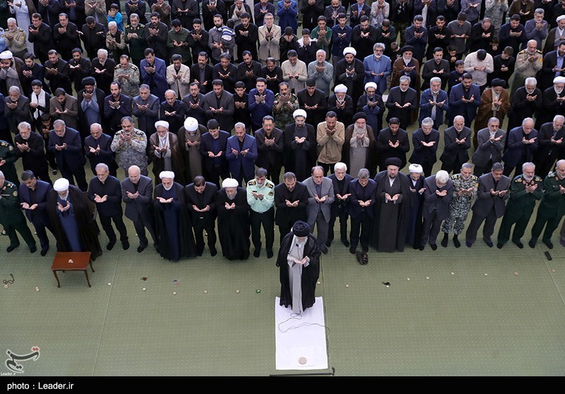 وارد مصلّا که میشویم، دو صف از مسئولان در قسمت جلو تشکیل شده؛ آن طرف، در بخشی که قرار است مقام معظم رهبری و برخی مسئولان عالیرتبه حاضر شوند، سید عبدالله صفیالدین برادر سیدهاشم صفی الدین، نماینده حزبالله لبنان در ایران، نخستین کسی است که نشسته است.