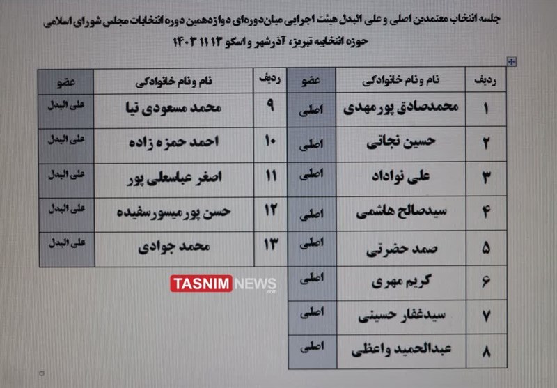 آقایان محمدصادق پورمهدی ، حسین نجاتی، علی نواداد، سید صالح هاشمی، صمد حضرتی، کریم مهری، سیدغفار حسینی و عبدالحمید واعظی اعضای اصلی و آقایان محمد مسعودی نیا ، احمد حمزه زاده، اصغر عباسعلی پور، حسن پورمیسور و محمد جوادی نیز به عنوان اعضای علی البدل میان دوره ای دوازدهمین دوره انتخابات مجلس شورای اسلامی حوزه انتخابیه تبریز، آذرشهر و اسکو انتخاب شدند.
