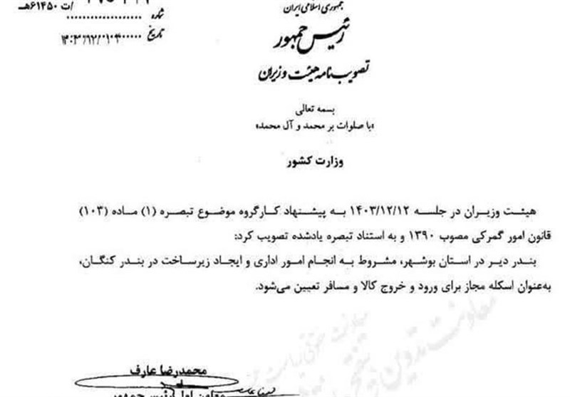در این مصوبه تأکید شده است که مرز مجاز برای بندر دیر مشروط به تکمیل زیر ساخت های بندر کنگان میباشد .