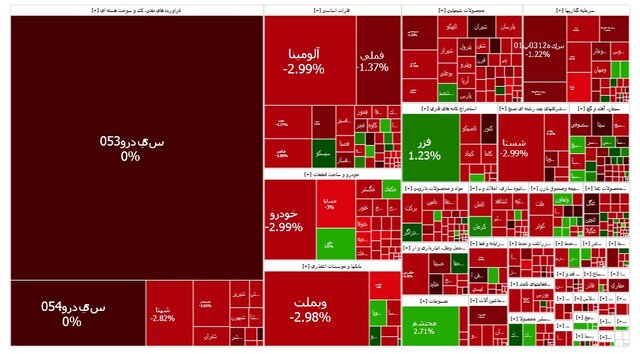 فارس، فملی و وبملت بیشترین تاثیر منفی را بر شاخص بورس داشتند. از نمادهای پرتراکنش نیز میتوان به آلومینا، وبملت و محتشم اشاره کرد.