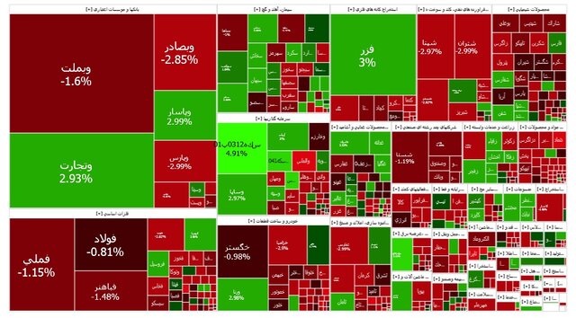 فملی، فولاد و وبملت بیشترین تاثیر منفی را بر شاخص بورس داشتند. از نمادهای پرتراکنش نیز میتوان به وتجارت، وبملت و وبصادر اشاره کرد.
