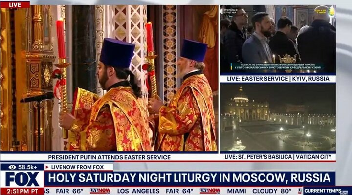 ماجرا زمانی رخ داد که شبکه آمریکایی فاکس نیوز مراسم عید پاک کلیسای ارتدکس اوکراین را از کلیسای جامع St. Michael’s Golden-Domed Cathedral در کی یف به موازات پخش مراسمی در کلیسای جامع Christ the Savior در مسکو پخش کرد که ولادیمیر پوتین رئیس جمهور روسیه در آن شرکت داشت.