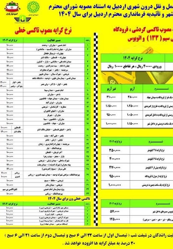 به گزارش بخش استانها در وبانگاه به نقل از خبرگزاری تسنیم از اردبیل، عاطف محمدنژاد در جلسه امروز شورای شهر اردبیل، اظهار داشت: کرایه جدید تاکسی، اتوبوس و ون در شهر اردبیل اعلام شد که بر اساس نرخهای مصوب شورای شهر و تأیید فرمانداری اردبیل، کرایه تاکسی و اتوبوس بین 35 تا 40 درصد افزایش داشته است.