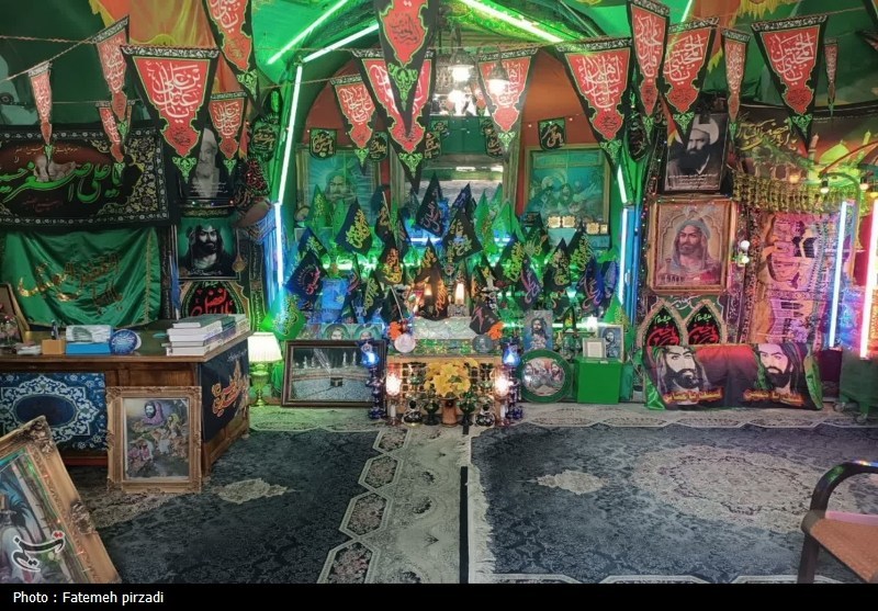 در دل این فضا منبر چوبی، چراغهای نفتی، قابهایی از شمایل امامان، تصاویر شهدا و درگذشتگان، شمع، استکان و گلاب گرد هم میآیند تا خانه را به حسینیهای کوچک بدل کنند.
