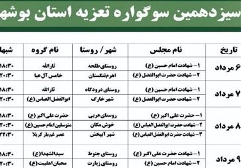 گروههای راه یافته به سیزدهمین سوگواره تعزیه استان بوشهر با بازبینی مرتضی نوری فیروزی، فرید میرشکار و علیرضا میرشکاری 6 تا 10 مرداد ماه به میزبانی شهرستان دشتی، شهر خورموج طی 4 شب برگزار میشود.