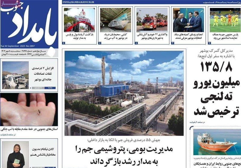 عناوین مطبوعات استان بوشهر در 8 مهر1404/ 135.8 میلیون یورو ته لنجی ترخیص شد
