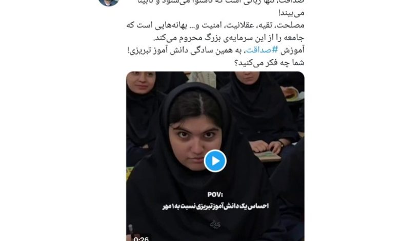 عزتالله ضرغامی، از اعضای شورای عالی فضای مجازی نیز با بازنشر بخشی از این ویدیو در صفحه شخصی خود در شبکه اجتماعی ایکس نوشت: صداقت، تنها زبانی است که ناشنوا میشنود و نابینا میبیند! مصلحت، تقیه، عقلانیت، امنیت و غیره بهانههایی است که جامعه را از این سرمایه بزرگ محروم میکند. آموزش صداقت، به همین سادگی دانشآموز تبریزی.