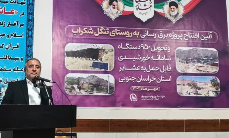 به گزارش خبرنگار تسنیم از بیرجند، سید محمدرضا هاشمی، استاندار خراسان جنوبی، امروز در آیین افتتاح پروژه برقرسانی به روستای تنگل شکراب و تحویل 950 دستگاه سامانه قابل حمل برق خورشیدی به عشایر استان، با بیان اینکه خدمت در مناطق روستایی یک افتخار بزرگ برای مدیران نظام جمهوری اسلامی است گفت: اینکه امروز در دل یک روستا و در جمع مردمی صادق، پاکدست و پرتلاش حضور داریم، برای بنده یک افتخار بزرگ است؛ مردم روستا با دستان پینهبسته خود ستونهای نظام را نگه داشتهاند.
