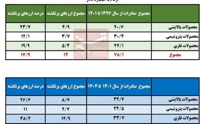 بر اساس این آمار، طی سالهای 1401 تا 1404، محصولات پالایشی با صادرات 32.7 میلیارد دلار بوده که 8.7 میلیارد دلار ارز را برنگرداندند، که این مقدار معادل حدود 26.6 درصد می شود. صادرات پتروشیمی نیز با مجموع 24.5 میلیارد دلار، 2.7 میلیارد دلار بازگشت ارز نداشته که معادل 11 درصد از کل ارز صادراتی این بخش است که برنگشته است. در همین مدت، محصولات فلزی با صادرات 33.7 میلیارد دلار، 12.9 میلیارد دلار از منابع ارزی خود را بازنگرداندهاند؛ یعنی 38.2 درصد از کل ارز صادراتی این گروه.