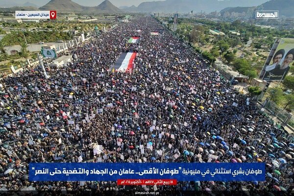 در بیانیه پایانی راهپیمایی میلیونی مردم یمن تأکید شد: ما به برادرانمان در فلسطین درباره تعهد مداوم خود به آرمان فلسطین و حمایت دائمی از آنها اطمینان می دهیم و همانطور که رهبرمان گفت، به آنها میگوییم: “شما تنها نیستید.”