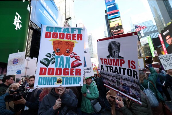 به گزارش راشا تودی، راهپیمایی اعتراضی «نه به پادشاه» در نیویورک، میدان تایمز مملو از جمعیتی است که یکصدا فریاد میزنند: «ترامپ همین الان باید برود.»