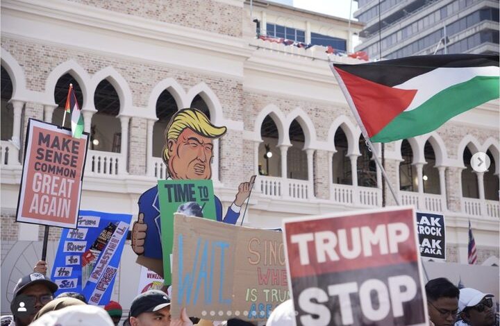 به گزارش “بخش بینالملل هاب خبری وبانگاه” به نقل از خبرگزاری مهر به نقل از راشاتودی، حامیان فلسطین و معترضان مالزیایی به سیاستهای دونالد ترامپ، رئیس جمهور آمریکا، در هنگام ورود وی به کوالالامپور برای حضور در اجلاس اتحادیه کشورهای جنوب شرق آسیا، دست به تجمع زدند.