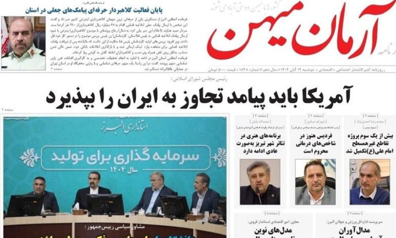 تصاویر و تیترهای برگزیده صفحات نخست روزنامههای دوشنبه 19 آبانماه در استان البرز شامل «پیام سپیدار»، «آرمان میهن»، «دنیای هوادار» و «پیام آشنا» منتشر شد. این مرور مطبوعاتی بازتابدهنده مهمترین رویدادها، چالشها و تحولات اقتصادی، اجتماعی و زیستمحیطی استان است.