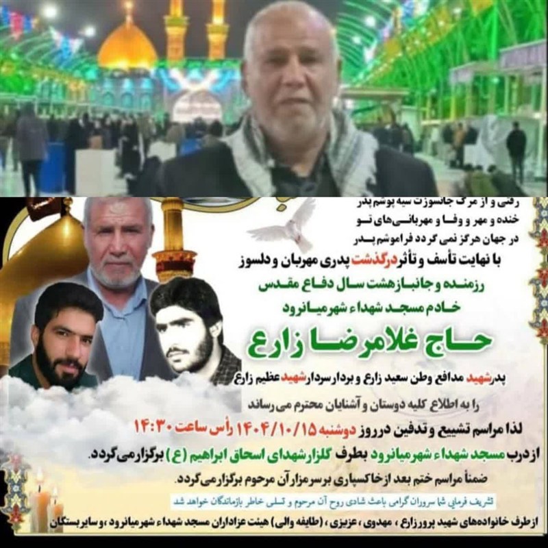 حاج غلامرضا زارع پدر شهید مدافع وطن سعید زارع و شهید عظیم زارع به ملکوت اعلا پیوست.