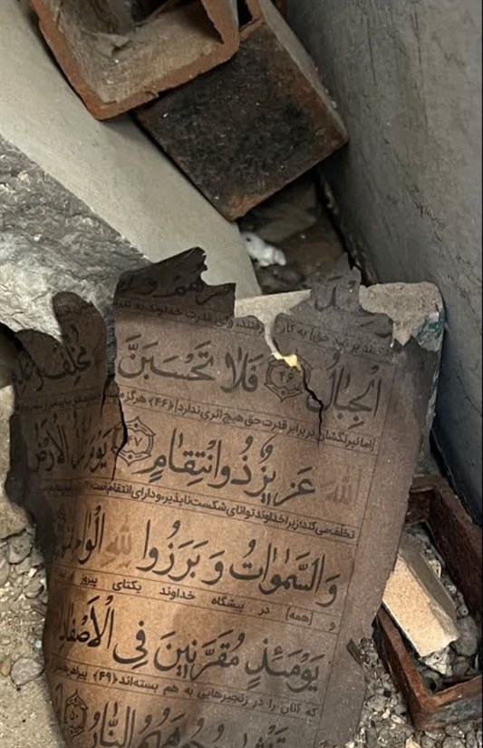 در ادامه تصویری از برگی از قرآن به آتش کشیده را مشاهده میکنید که به آیه إِنَّ اللَّهَ عَزِیزٌ ذُو انْتِقَامٍ آیهای از سوره ابراهیم در میان آتش نمرودیان در حمله 18 دی به حرم حضرت سبزقبا علیهالسلام.