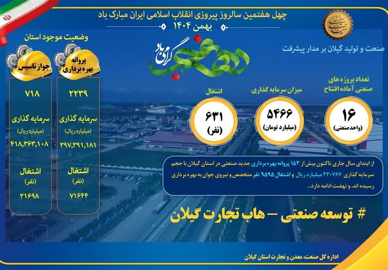 وی در ادامه با اشاره به عملکرد حوزه صنعت استان از ابتدای سال جاری گفت: از ابتدای سال تاکنون بیش از 153 پروانه بهرهبرداری صنعتی در استان گیلان صادر شده که با سرمایهگذاری بیش از 230 هزار میلیارد ریال، زمینه اشتغال 9 هزار و 595 نفر از جوانان استان را فراهم کرده است.