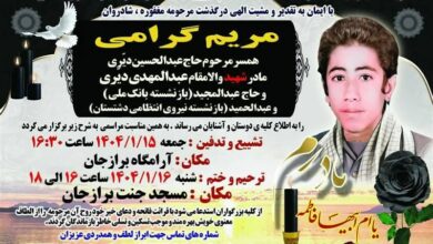 مدیرکل بنیاد شهید و امور ایثارگران استان بوشهر با اشاره به درگذشت مادر شهید عبدالمهدی دیری گفت: پیکر این مرحومه ساعت ۱۶:۳۰ امروز جمعه ۱۵ فروردین در برازجان تشییع و…